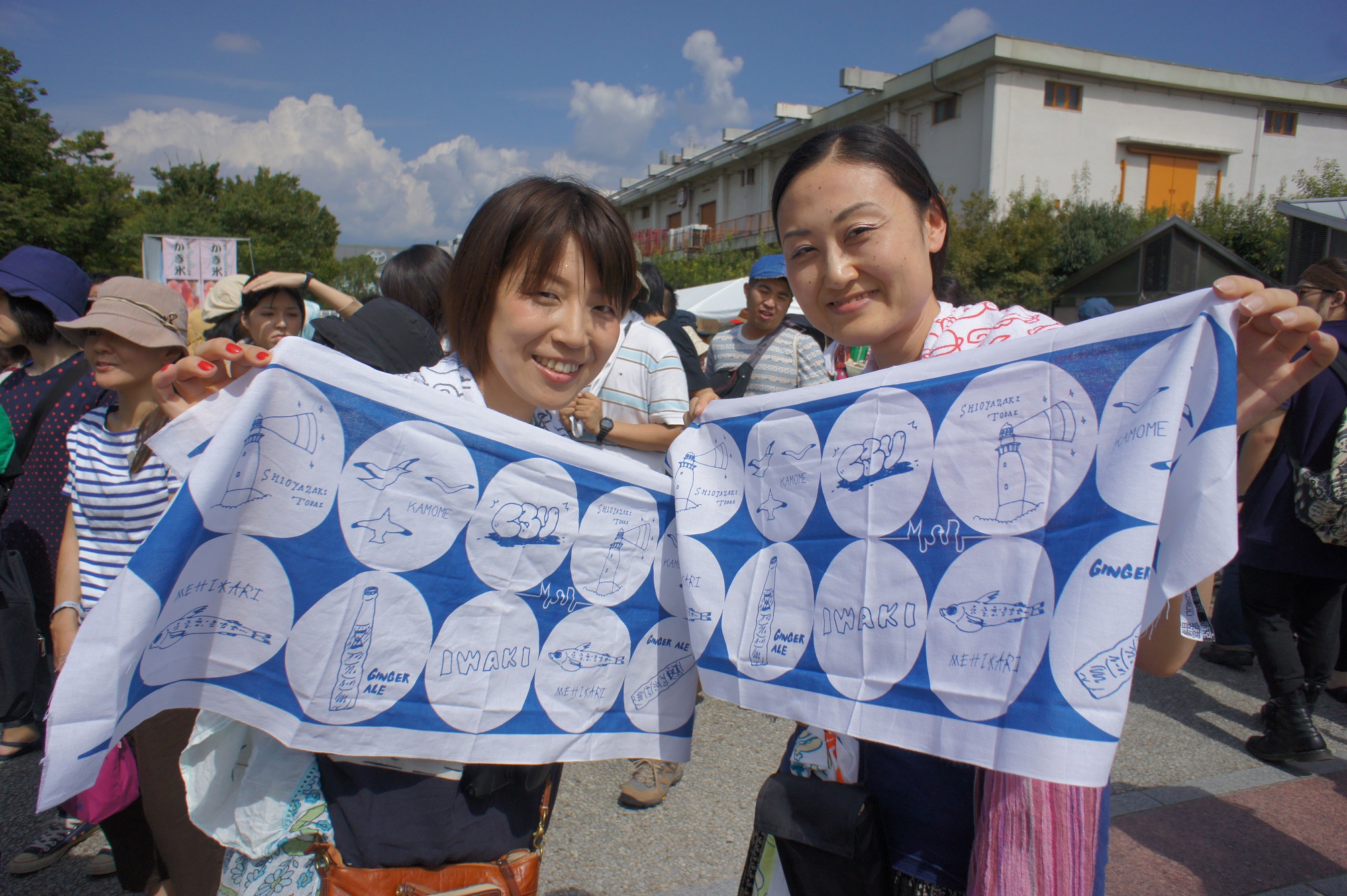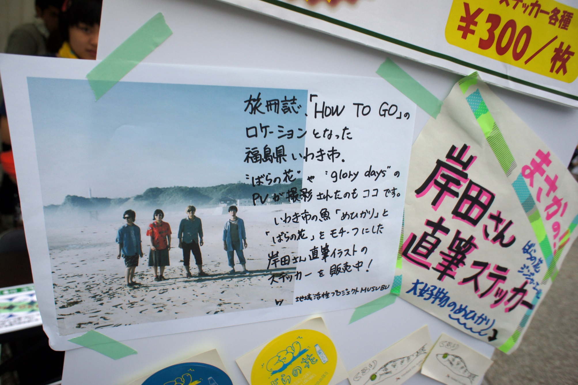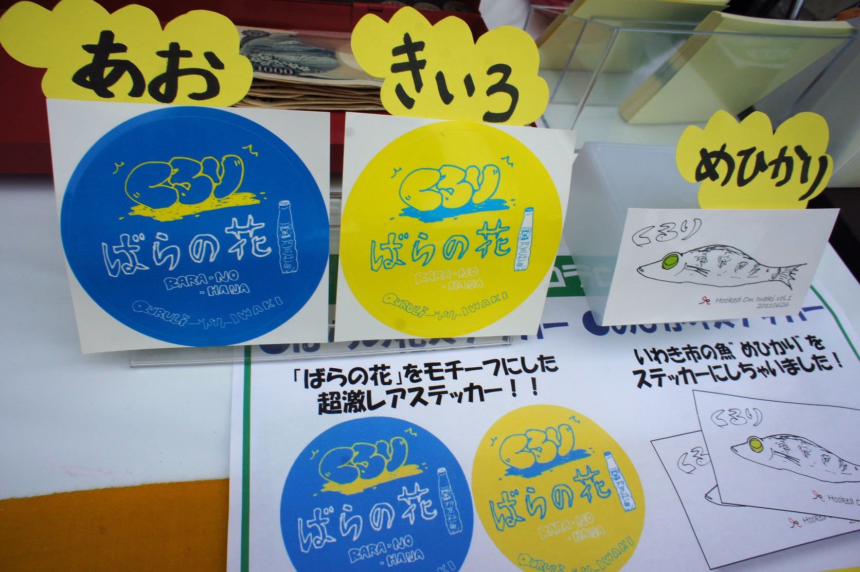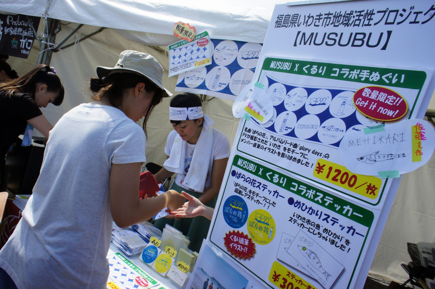 昨年に続き2度目のブース出店となった今回は、くるりの皆さん直筆イラストをデザインした「いわき手ぬぐい」と、彼らの代表曲「ばらの花」のミュージックビデオをいわき市薄磯海岸で撮影されたことにちなみ「ばらの花ステッカー」を制作、会場で販売。手ぬぐいは好評につき完売となりました。